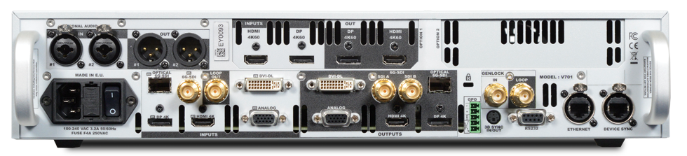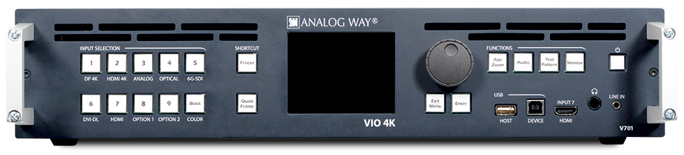 Der VIO 4K besitzt 7 universelle Eingänge, die als HDMI, DVI, 6G-SDI, Display Port und universelle Analogports (VGA) ausgeführt sind. Aus den anliegenden Videosignalen kann jeweils ein Signal ausgewählt und auf bis zu drei unabhängig skalierte Ausgänge geschaltet werden.