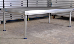 Das Kernstück einer nivtec-Bühne ist das Systempodest. Es besteht aus einem Aluminiumrahmen aus speziell ausgebildeten Feder- und Nutprofilen mit integrierter Verriegelungsmechanik und einer rutschfesten, wasserfest verleimten Multiplex-Siebdruckplatte mit einer Belastbarkeit von 750kg/Quadratmeter. Durch die serienmäßige Ausstattung mit vier Multifunktionsöffnungen wird die Anbringung von Befestigungselementen für Geländer, Treppen, Tribünen und sonstige Aufbauten leicht gemacht. Die Feder- und Nutprofile des Rahmens gewährleisten ein einfaches Einhängen der Podeste ineinander. Die integrierte Klick-Klack-Mechanik erlaubt schnelles und sicheres Verriegeln der Elemente untereinander, wodurch ein fester Verbund der gesamten Bühnenfläche ohne Stolperfallen an den Nahtstellen der Podeste entsteht. Dank der Verriegelungsmechanik sind zudem auch weniger Bühnenfüsse nötig als bei üblichen Systemen, bei denen jedes Element vier Stützen braucht. Das spart erheblich Platz & Gewicht beim Transport.